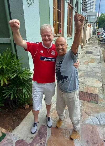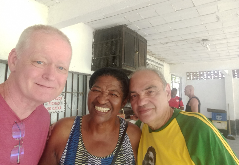 Peter Arnholdt er netop i disse dage fra 19. september til 29. september på fodboldtur og ses her på turen sammen med fodboldlegenden Garrinchas datter Rosângela og forfatteren Cláudio Aragão. Foto: Privatfoto.