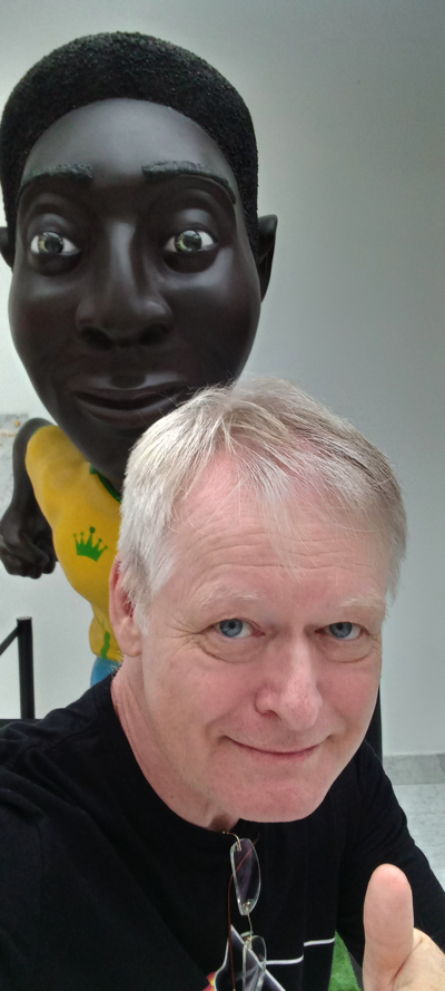 Peter Arnholdt foran en figur af den mest berømte brasilianske spiller i historien, Edson Arantes do Nascimento, bedre kendt som Pelé. Foto: Privatarkiv.